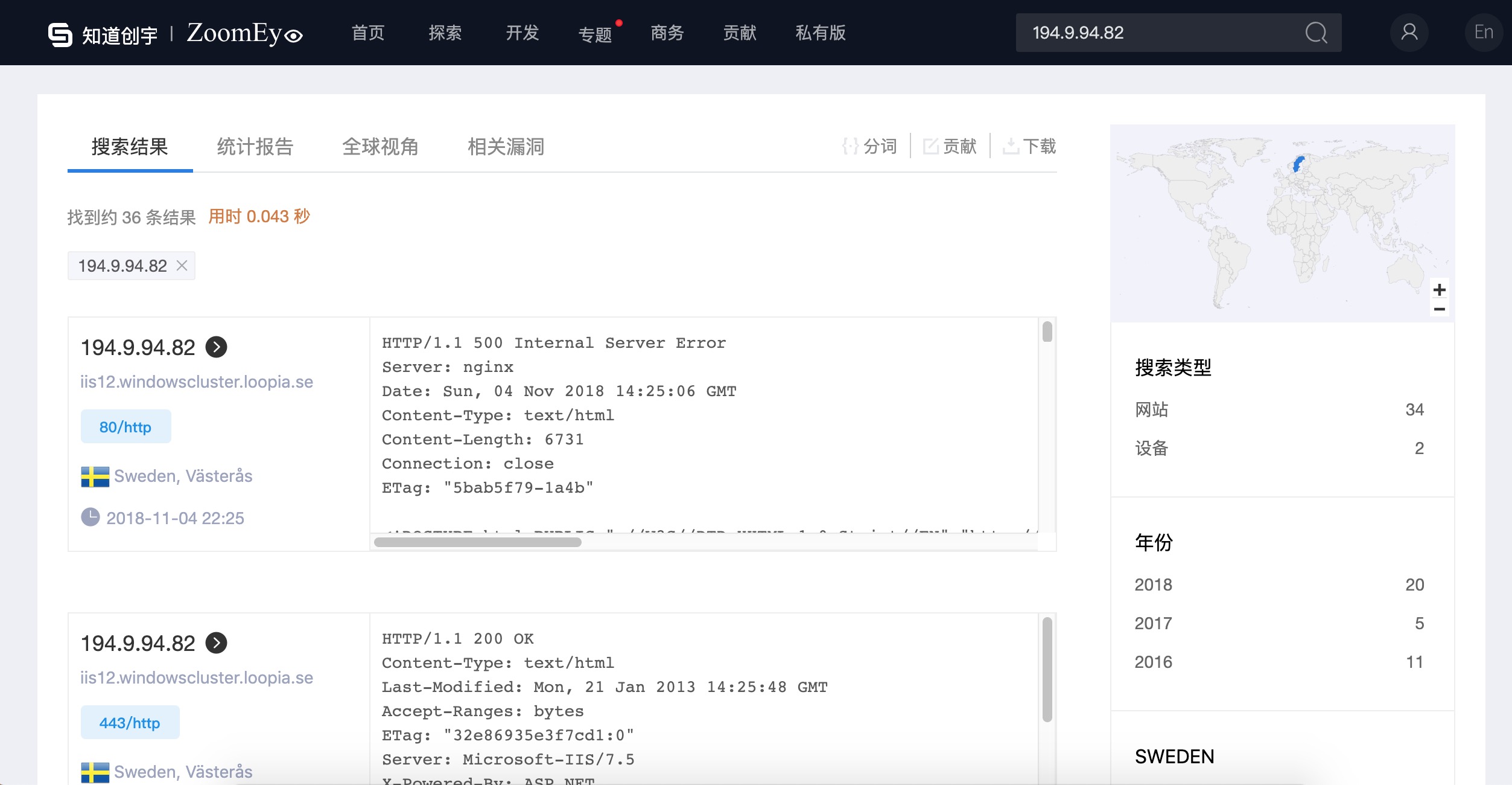 根据所泄露的 IP 地址,在 Shodan 上未检索到相关信息,在知道创宇 ZoomEye 上检索到 36 条数据,位于瑞典。