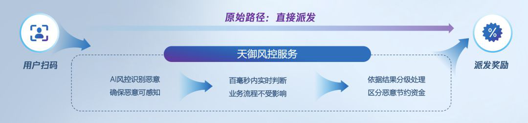 构建风控体系是白酒行业全链路信息化解决方案不可缺失的部分。基于腾讯20年黑灰产对抗经验、大量黑产数据积累以及AI智能风控能力,腾讯安全天御已形成独有的风控系统和安全能力,在用户扫码到派发奖励这一直接派发路径中进行安全风险拆解,加入精准识别、实时判断和分级处理三层保障,为白酒行业量身定制营销风控服务,可快速识别黄牛党的恶意伪装,避免企业营销资金被薅取。