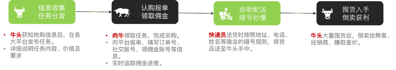 随着电商兴起之后,黄牛起初尝试过用机器批量注册,但很快被品牌的风控措施拦截。于是只好再次去雇佣人力,并创造出了一种“人肉众包”手段。这种手段主要由“任务分发——多人抢购——物流运输——倒卖获利”四个环节共同组成的链条。其中,众多参与者负责扮演不同的角色,分工明确的作案手法令人咋舌。