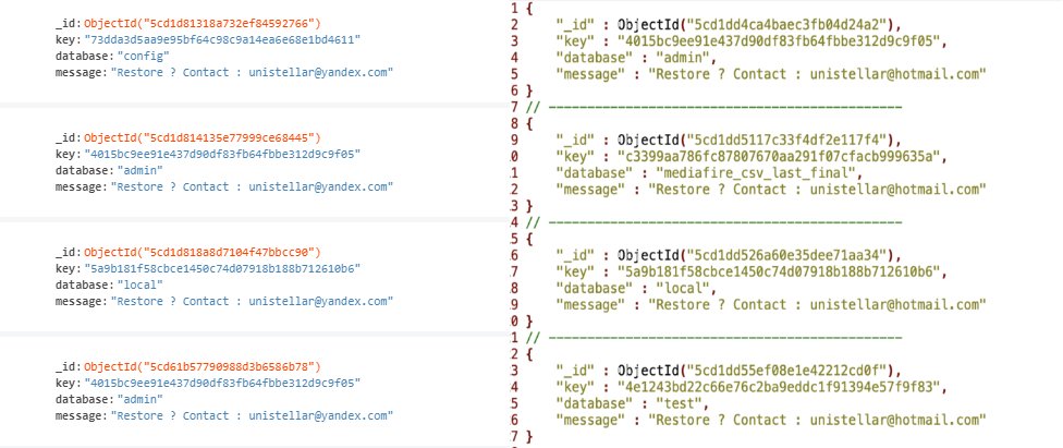 研究人员使用BinaryEdge搜索引擎发现了由Unistellar黑客组织删除的12,564个未受保护的MongoDB数据库(Shodan报道的数量较少,为7,656个数据库,可能是因为查询被阻止)。根据Jain所说,目前,BinaryEdge索引了超过63,000台可公开访问的MongoDB服务器,Unistellar黑客组织似乎已经删除了约20%。研究人员于4月24日首次注意到此类攻击,当时他发现了一个被删除的MongoDB数据库。不同于过去经常发现的大量的泄露数据,其只包含以下信息:“想要恢复?联系方式:unistellar@yandex.com。”