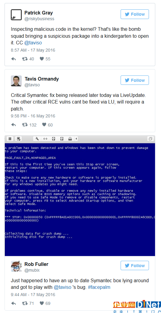 杀毒软件本身存在安全漏洞早已不是新鲜事,最新一个曝出高危漏洞的杀毒软件是赛门铁克。它的核心杀毒引擎在解析用aspack早期版本打包的可执行文件时会发生缓冲溢出。赛门铁克核心杀毒引擎被Symantec和Norton品牌的产品广泛使用。该漏洞编号为CVE-2016-2208,是一个远程代码执行漏洞,可通过向受害者发送包含文件的邮件或链接利用。