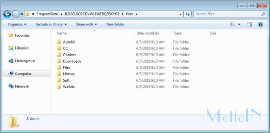 下载文件并配置持久性后,Vidar木马将从受感染设备中收集大量数据,并在%ProgramData%文件夹中的随机命名目录下进行编译,如下图所示: