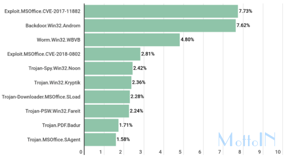 在2019年第一季度,垃圾邮件中最常见的恶意软件是Exploit.MSOffice.CVE-2017-11882,占比为7.73%。其次是Backdoor.Win32.Androm(7.62%)和Worm.Win32.WBVB(4.80%)。第四名是另一个Microsoft Office漏洞利用Exploit.MSOffice.CVE-2018-0802,其占比为(2.81%)。第五是Trojan-Spy.Win32.Noon(2.42%)。