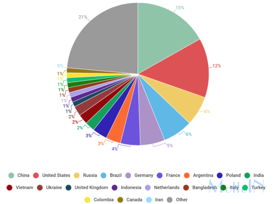 中国(15.82%)是最大的垃圾邮件来源地区,其次是美国(12.64%)。Top 3常客德国(5.86%)本季度下降至第五,将第三名拱手相让给俄罗斯(6.98%)。巴西(6.95%)来到了第四,第六是法国(4.26%),后面依次是阿根廷(3.42%)、波兰(3.36%)和印度(2.58%)。越南(2.18%)跌出了榜单。