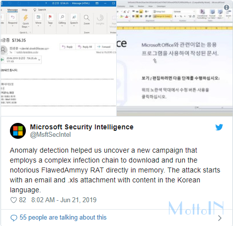 恶意电子邮件通过互联网传播,就像杂草一般野蛮生长。微软公司最近发现了一个新的威胁活动,其中包含复杂的感染链,将臭名昭著的FlawedAmmyy远程管理工具(RAT)作为最终的有效载荷。威胁活动始于一封恶意电子邮件,其中包含.XLS附件和韩语内容。