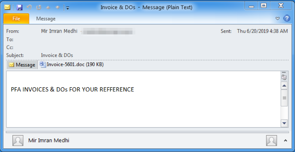 TA505黑客组织使用包含.DOC和.XLS文档的垃圾邮件来传播其新的恶意软件。受害者打开恶意附件后,通过执行VBA宏命令在受攻击的机器上部署payload。据Trend Micro报道,少量垃圾邮件样本还使用了恶意的URL,导致名为FlawedAmmyy的远程访问木马(RAT)下载。