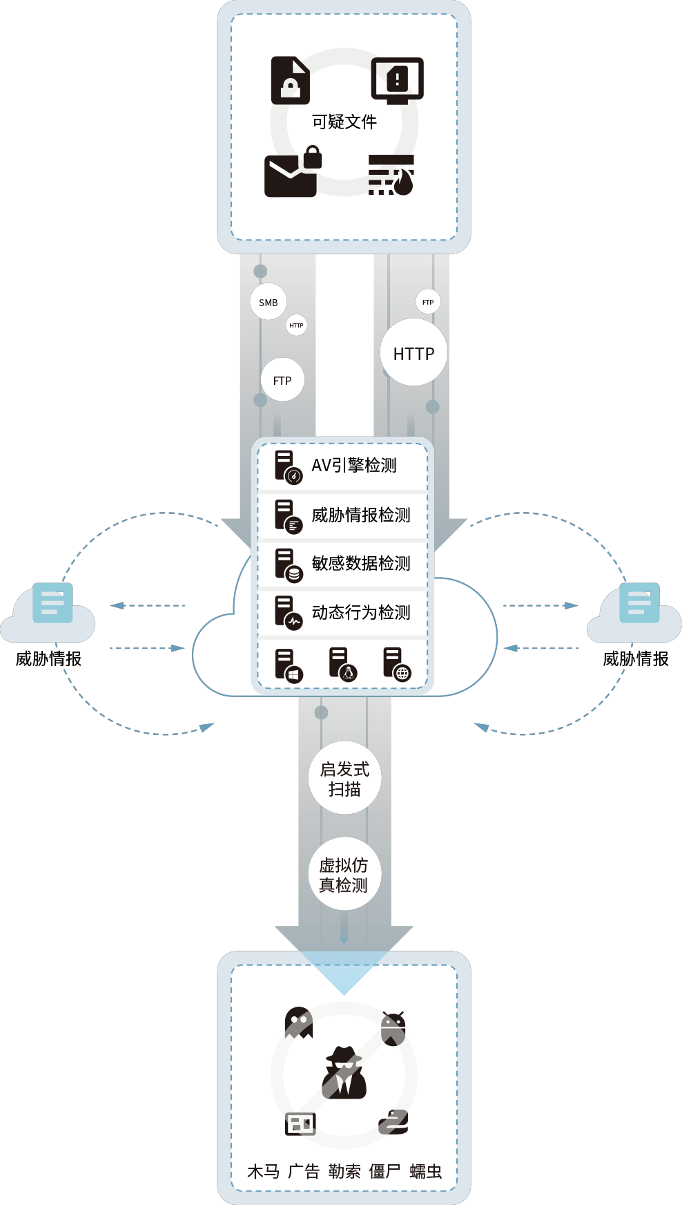 模拟文件的真实运行环境,触发文件的各种操作行为,包括对文件系统、服务、注册表和网络的操作行为分析以及行为过程中外连对象的威胁情报匹配。