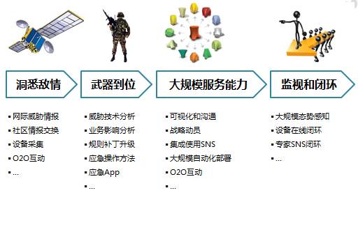 如何应对安全问题才能适应变革?绿盟科技专家一针见血地指出——是连接,用连接来防护。很多信息安全防护大都是单兵作战,如:防火墙、网闸、审计类的产品等,如果将各个单兵融合起来,提供大规模的服务能力,如:由预警机发现威胁,通过威胁情报洞察敌情,接着用安全厂商提供解决问题的能力,这样就可以跟好的提供服务产业链,从而形成监视和闭环。