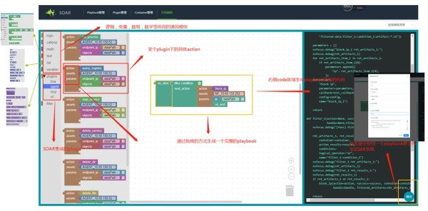 针对已知威胁并固化了相应playbook执行脚本的案例,当威胁发生时并送入到SOAR平台中,SOAR引擎自动调用固化的playbook脚本,依据playbook固化的处理流程及处理优先级,实现对威胁的全局封堵、被感染主机清除及被影响主机的加固等过程。 针对未知威胁尚未形成相应的playbook执行脚本时,系统在威胁研判过程逐步形成的威胁证据链,依据威胁的紧迫度及危险程度等条件,依据响应优先级(优先级从高到低:阻断传播路径-清除-加固)调用微场景化的通用playbook执行脚本,实现对威胁的全局封堵、被感染主机的威胁清楚及被影响主机的加固过程等。微场景化的通用playbook脚本包括: Ø 全局通用playbook脚本如:block-ip、block-url、ip-isolation等; Ø 被感染主机通用威胁清除playbook如:kill-process、delete-file、kill-task、disable-service、clear-registor等 Ø 受影响主机的通用加固playbook如:disable-service、add-NF-rule等。 在通过微场景化的通用脚本处置完成并经过验证无误后,系统可以根据已经执行的通用playbook进行编排生成固化的针对当前威胁案例的playbook,后续当相同威胁进入网络中,SOAR则依据处置的优先级及紧迫度,依次执行固化后的响应剧本。 3.2.2自动化playbook生成 绿盟科技采用blockly框架技术,以所见即所得的方式,基于图形化界面以拖拽方式进行playbook的自动化生成。 大幅度提升playbook的编排过程,并降低人为因素导致的playbook剧本编制过程的错误。