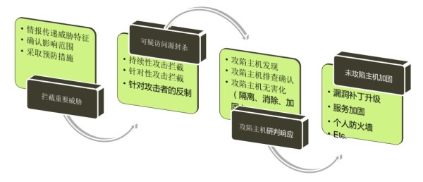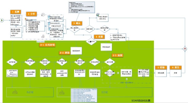 在绿盟科技整个安全运营体系中,将MDR及SOAR的能力有机的和绿盟安全态势平台融合实现了安全运营从监测、分析、研判、智能化决策、到编排及自动化响应整个7*24小时自适应持续闭环过程。 利用态势平台实现安全数据的监测及智能化分析,利用关联分析、机器学习等技术手段,结合威胁情报,对事件及行为进行识别、推理及智能化预测过程; 基于MDR,依托威胁狩猎+主动取证等技术手段,实现事件、行为的轨迹取证、对响应数据进行收集确认。 基于SOAR,针对已知威胁,通过已经编排固化的playbook剧本,实现对威胁的自动化处置闭环;对于未知威胁,根据MDR step-by-step的取证过程,依据威胁的紧迫度等实现响应动作优先级的,并针对响应设备进行编排,下发响应动作; 依托NDR、EDR的联动响应能力,实现安全威胁拦截、封堵、清除,并最终实现系统加固以防止下一次被攻陷的可能。 4.3. 绿盟安全运营流程案例 利用以上的安全运营的联动体系,绿盟科技不仅保证了安全运营流程的闭环过程,同时保证安全运营闭环的实时性和高效性,有效的做到了事中的拦截和封堵,事后的隔离、清除。并在下一次的攻击前做到事前的加固。 如下是绿盟科技依托SOAR实现的全局封堵、失陷主机清除、未失陷主机加固的全流程: