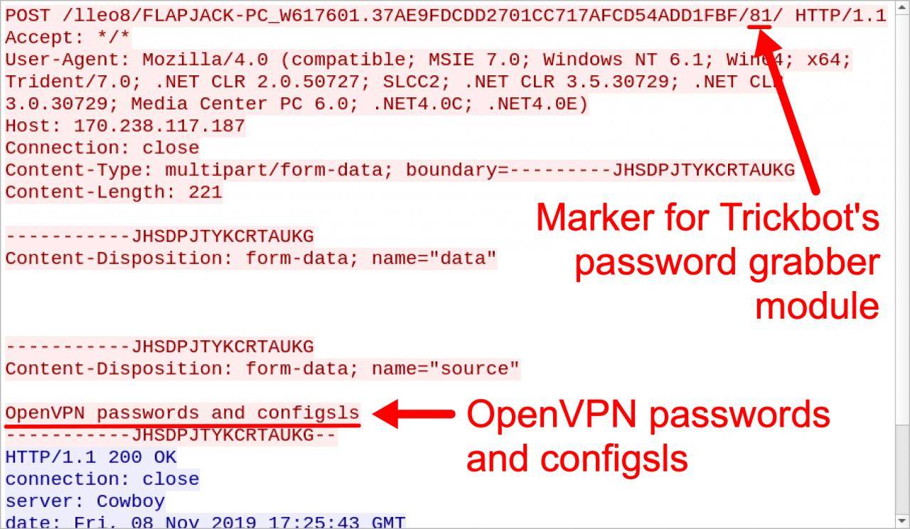 图 4. Trickbot密码窃取模块窃取Open OpenVPN密码和配置的HTTP POST请求
