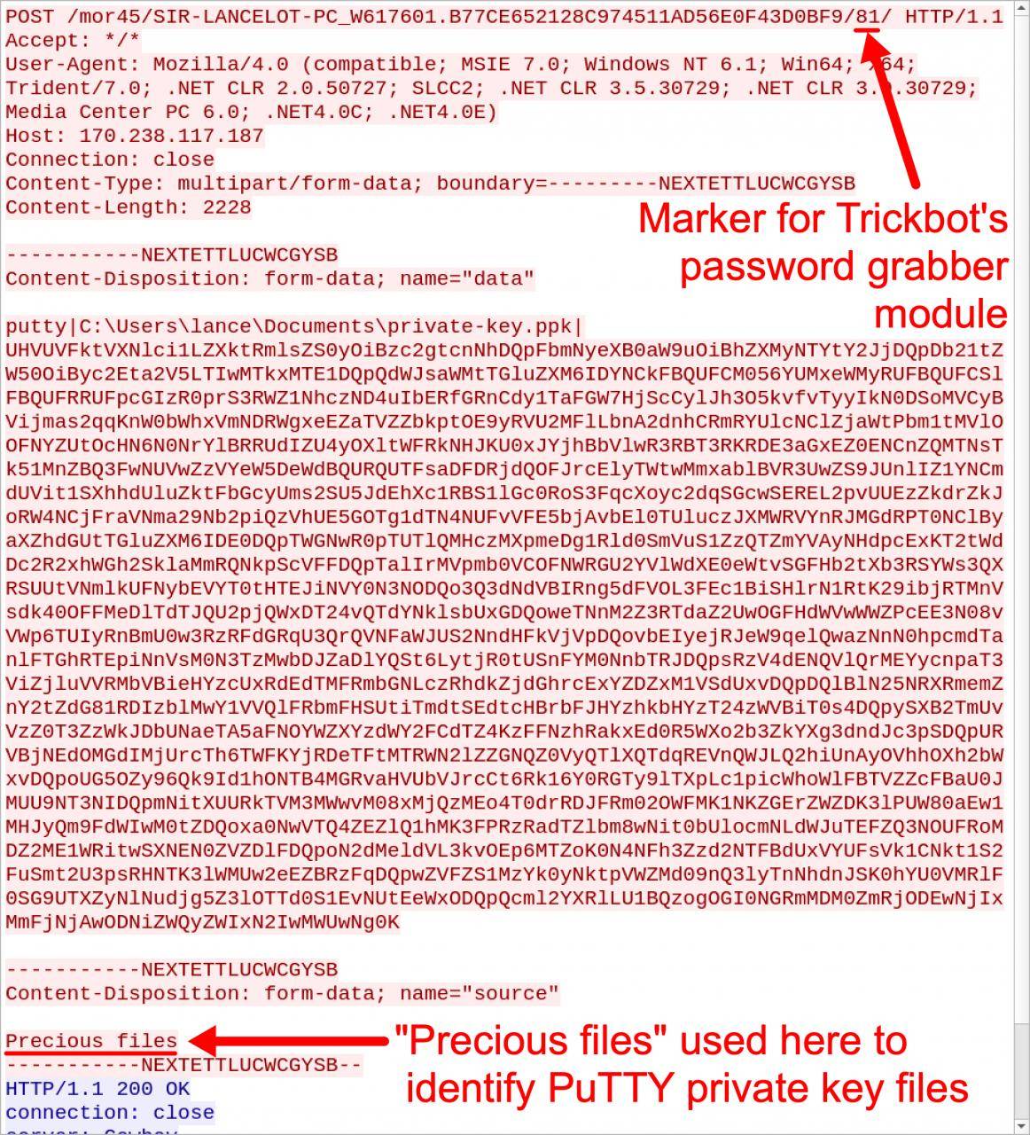 图 6. Trickbot密码窃取器模块窃取PuTTY使用的私钥产生的HTTP POST请求