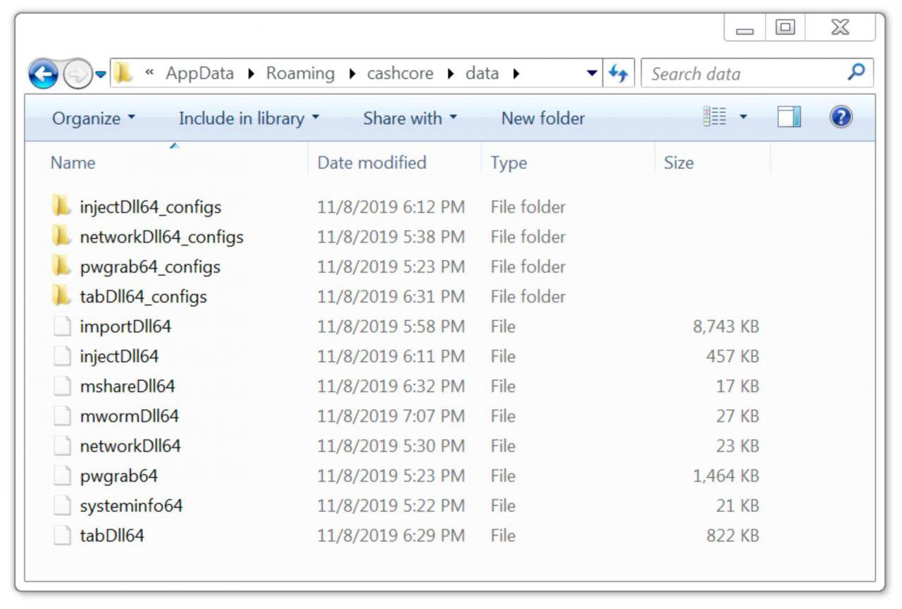 感染了Trickbot的Windows主机会下载不同的模块来执行不同的功能。这些模块以加密二进制文件的形式保存在受感染用户的AppData\Roaming文件夹中。然后加密的二进制文件会解码为DLL文件,并在系统内存中运行。图1是2019年11月8日Trickbot感染64位Windows 7系统主机生成的编码的Trickbot模块。