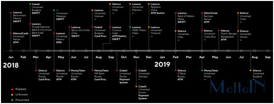 这些组织通常会在被攻破的网络上花费大量时间,以便它们能像被监控的受害者一样管理金融业务。Group-IB 绘制的网络攻击地图显示,不管成功与否,这些组织从2018 年下半年开始就进入了活跃期,几乎每个月都有大动作。