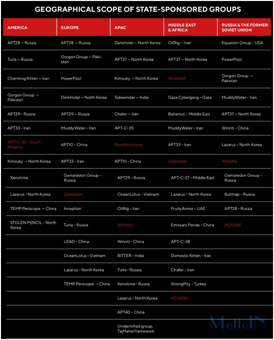 2018年下半年到2019年上半年,背后有国家撑腰的黑客(APT组织)依然很忙。在Group-IB 列出的38个组织中,有7个是今年新冒头的组织。虽然这些组织今年才被发现,但他们有的最早从2011年就开始运行了。