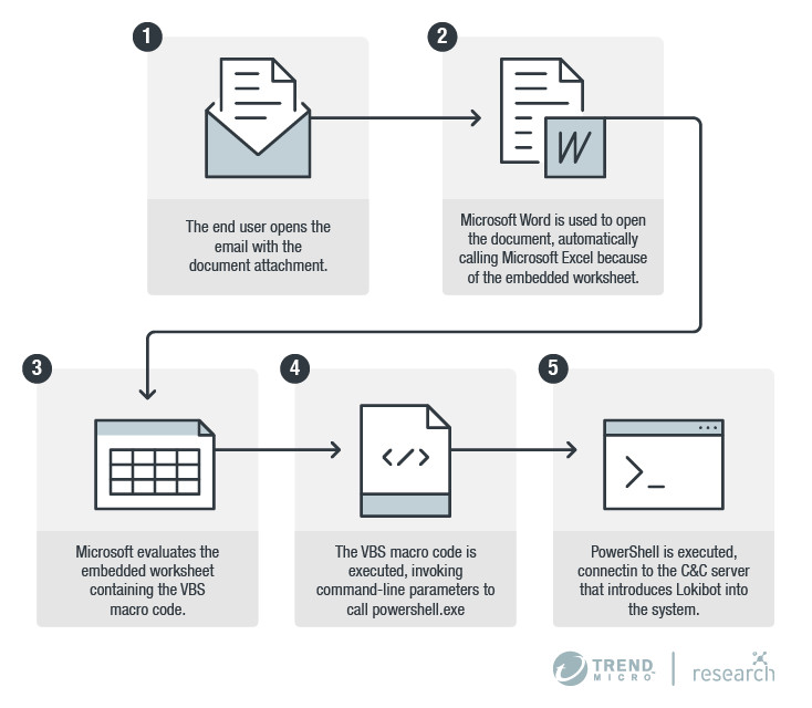研究人员发现LokiBot变种通过含有恶意RTF文件附件的垃圾邮件进行传播。RTF文件中含有嵌入的Excel OLE对象,使用Windows Management Instrumentation (WMI)和PowerShell来下载和执行恶意软件。