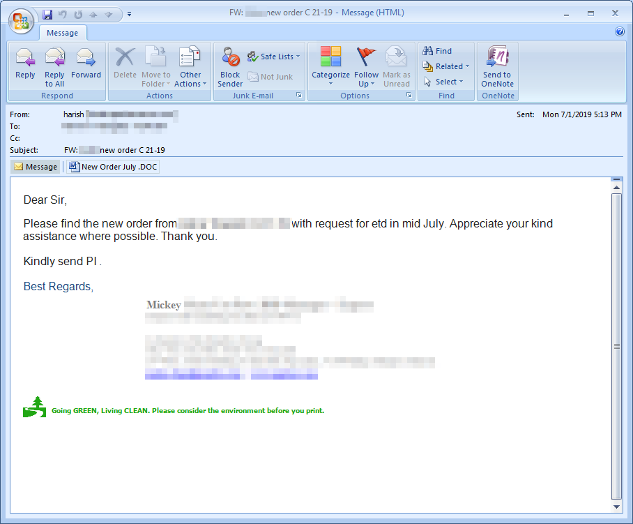 邮件样本中有多个元素。第一个也就最明显的就是sender name和邮件签名不匹配,表明这可能是一个恶意消息。第二个是sense of urgency:邮件的发送时间是7月1日,但邮件内容告知接收者订购的产品会在7月中旬送到。也就是说向接受者灌输一种急迫感,让接收者尽快打开附件。最后,邮件的IP地址37[.]49[.]230[.]149也表明是恶意的。