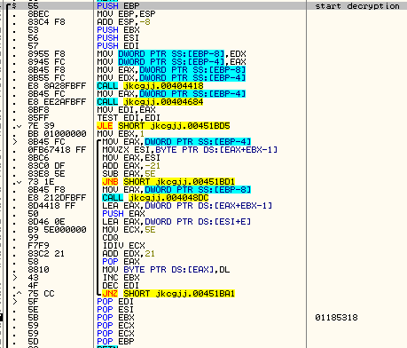 定位文件后,会开始解密过程。最终解密的文件是在解压之后的阶段加载。根据输入和输出,研究人员判断它没有使用AES这样的块来解密文件的内容,而是使用了自己的解密方法。