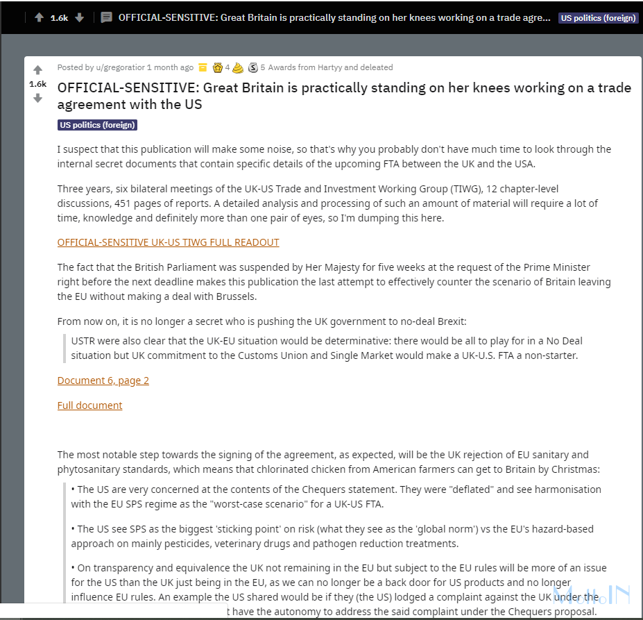 其在网站声明上表示:最近得知Reddit上有一篇帖子包含了英国泄露的文件。通过调查该账户及其关联账户,我们认为这是俄罗斯操纵活动的一部分,而这一切,都因一名为“Gregoratior”的用户10月份时在其网站上所泄露的文件。文件内容截图如下: