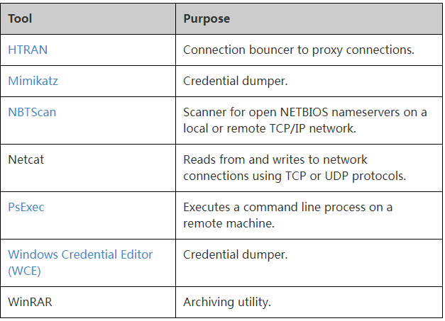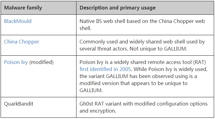下表中列出了 Microsoft 已经发现的一些被GALLIUM使用的工具: