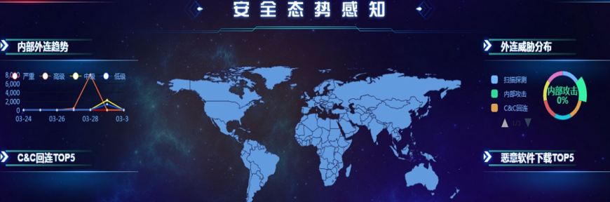 外连攻击威胁感知外连威胁是指内网主机或系统对外网相关主机或系统发起的攻击或可疑连接,若存在此类威胁则说明内网主机可能存在失陷危险。 内网主机或系统的失陷原因可能存在多种可能,如因为从某些网站或服务器下载、安装了有害的程序或木马,或者被邮件钓鱼(如鱼叉攻击)诱使打开了危险邮件,或者插入移动介质而被感染了有害程序或木马,或者被内网其它主机所渗透而植入了有害程序;用户应特别重视此类危险;但也不排除内网有主机或系统主动发起了对外网的攻击。 从信息安全的角度而言,如果网络中出现外连攻击威胁,则其风险其实要较外部的攻击威胁更大,从而更应引起相关安全人员的注意。
