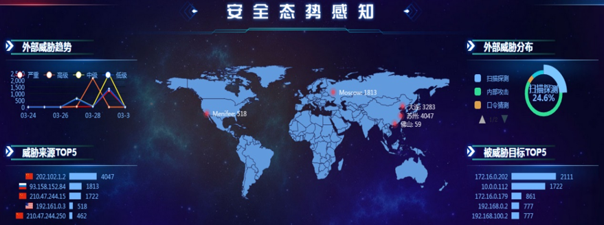 外部攻击威胁感知外部威胁是指有外网主机或系统对内网的主机或系统发起的网络攻击或可能的非法连接及探测。 网络攻击一般是指攻击者利用受害者主机或系统存在的一些缺陷/漏洞或者配置上的不足或者网络拓扑存在的问题,使用专用工具或手段对其进行探测、尝试、渗透,试图最终获得目标主机或系统的控制权,或者使受害者无法正常运行。 另外,可能的非法连接是指利用受害者主机或系统在某种情况下出现了不应暴露的端口,从而被非法入侵者所利用,如错误地将一些远程登录服务、数据库服务等暴露在公网环境。 聚铭安全态势感知与管控平台充分探知上述这些威胁,从而达到实时监控、实时处理的目的。