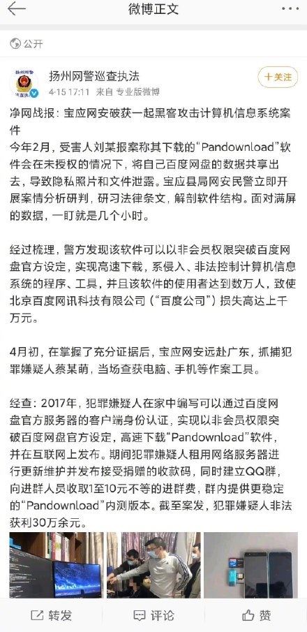 警方抓获百度网盘“破解版”Pandownload 开发者