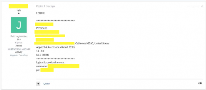 一位同意与卖家联系以获取样本的网络安全界人士证实了数据的有效性,并获得了两个账户的有效凭证,这两个账户分别是一家美国中型软件公司的CEO和一家欧盟连锁零售店的CFO。