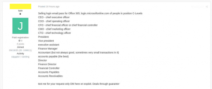 威胁行为者正在出售Office 365和微软账户的电子邮件和密码组合,他声称这些数据由占据职能的高级管理人员拥有,如: