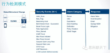 思科 NaaS 方案中,数据分析设备 Stealthwatch 对自身收集的网络访问大数据进行整理建模后,进一步在数据中进行大数据分析来发现各类违规。Stealthwatch 设计了大量的异常行为事件模板,从数据中提取安全事件。这些安全事件包括地址扫描、暴力破解、各类泛洪攻击、以及平时非常难检测的隐藏超长连接等等。内置超过 100 个安全异常行为,同时用户还可以定制自己的异常行为模板,让 NaaS 帮用户进行数据分析并告警。利用这些异常行为分析,能够帮用户发现网络渗漏、数据窃取以及 DDOS 等恶意行为。