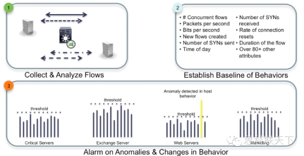 思科 NaaS 方案中,数据采集分析设备 Stealthwatch Management Console 在收集到 Netflow 信息后,会对信息进行存储,然后进行大数据分析。针对网络中出现流量的主机进行流量行为建模,每个主机的流量统计特征都不一样。