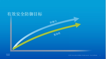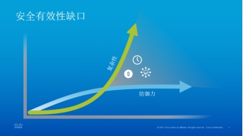 这三个元素给企业造成了新的安全挑战。威胁格局是动态的,不是静态的,企业客户要面对的网络安全防御新状态,经常会陷入一种“安全有效性缺口”的状态,即随着企业投资的增大,防御力并不能线性上升,复杂性却是指数级上升(参见下图一)。用户部署的安全产品能够提供给用户的防御力和其构成的复杂性之间存在的缺口,即是“安全有效性缺口”,会为企业客户带来成本、运营、人手方面的压力。企业真正期望的,其实是防御力能够随着投资呈线性增长、而且增幅大于复杂性的结构(参见图二)。