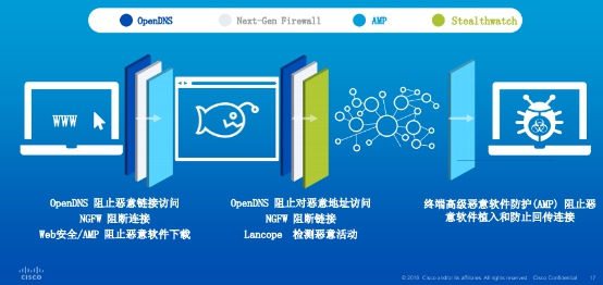 在整个过程中,思科高级恶意软件防护其实是持续性的,任何一个文件进来通过DNS和防火墙时都要进行异常分析判断,并保持持续跟踪和监控。当发现有异常动作的时候,系统就可以把它“抓”起来——这就是一个多层防御、覆盖整个攻击过程的防御。当然,要想达到这种效果,需要多种产品的联动。在上面勒索软件这个例子上,其实就有思科的四款产品(OpenDNS、高级恶意软件防护、下一代防火墙、Stealthwatch)在同时运作。