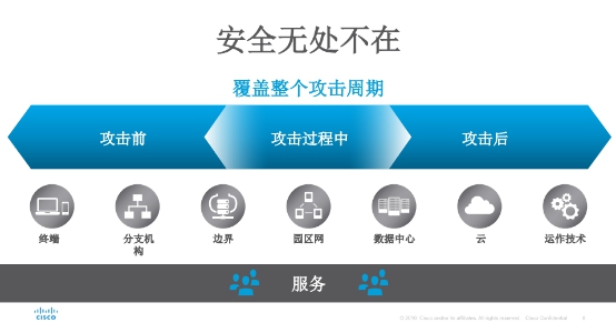 第一个差异是,思科认为安全防御不仅要覆盖企业网络的各个区域,更要覆盖整个攻击的周期,攻击前、攻击中、攻击后都要有应对的方法。以前大部分安全解决方案都过分集中在攻击前如何加固,并没有关注在攻击的过程当中和被攻击之后如何应对——这是因为过去威胁没有现在这么复杂,大部分企业相信只要把攻击前的加固做好了就安全了,就不会被攻破了;而现在,再强的外围防御也会被攻破,所以我们必须考虑一旦威胁攻击进入到了内网当中,企业应该如何应对以及如何去减少负面影响。