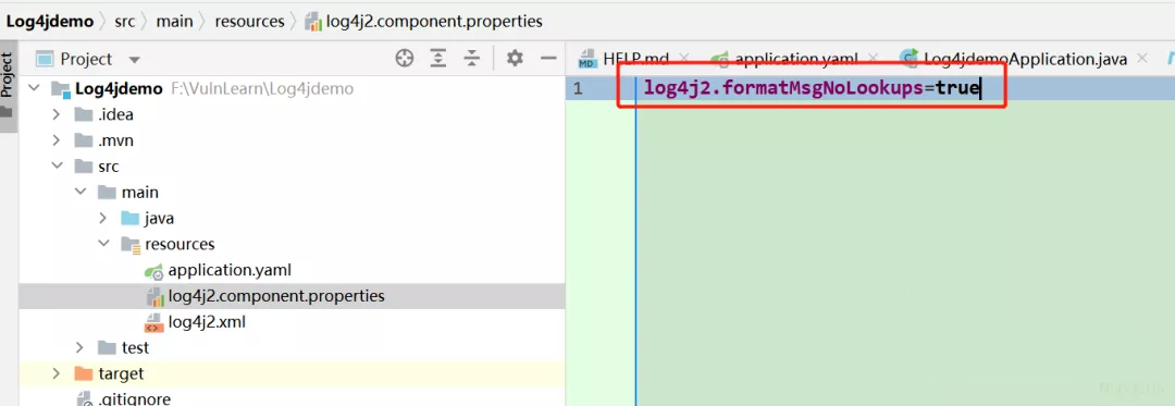 2、在应用的classpath下添加log4j2.component.properties配置文件,文件内容为:log4j2.formatMsgNoLookups=true