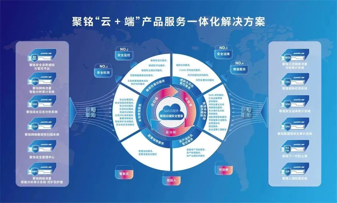“云”为聚铭云端安全管家,为广大不具备专业安全技术团队和建设能力的企业提供全方位的管家式托管服务,集中监控企业所部署的不同种类的安全产品,自动化发现和管理解决各类信息安全风险。“端”为安全产品,为网络安防建设需求和等保合规需求的客户提供一系列安全分析与检测的产品,主要包括聚铭安全态势感知与管控平台、聚铭网络流量智能分析审计系统、聚铭综合日志分析系统、聚铭网络脆弱性扫描系统、聚铭安全运维审计系统、聚铭数据库安全审计系统、聚铭入侵防御系统、聚铭下一代防火墙等产品。