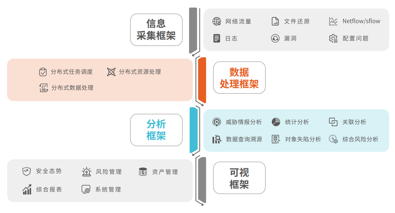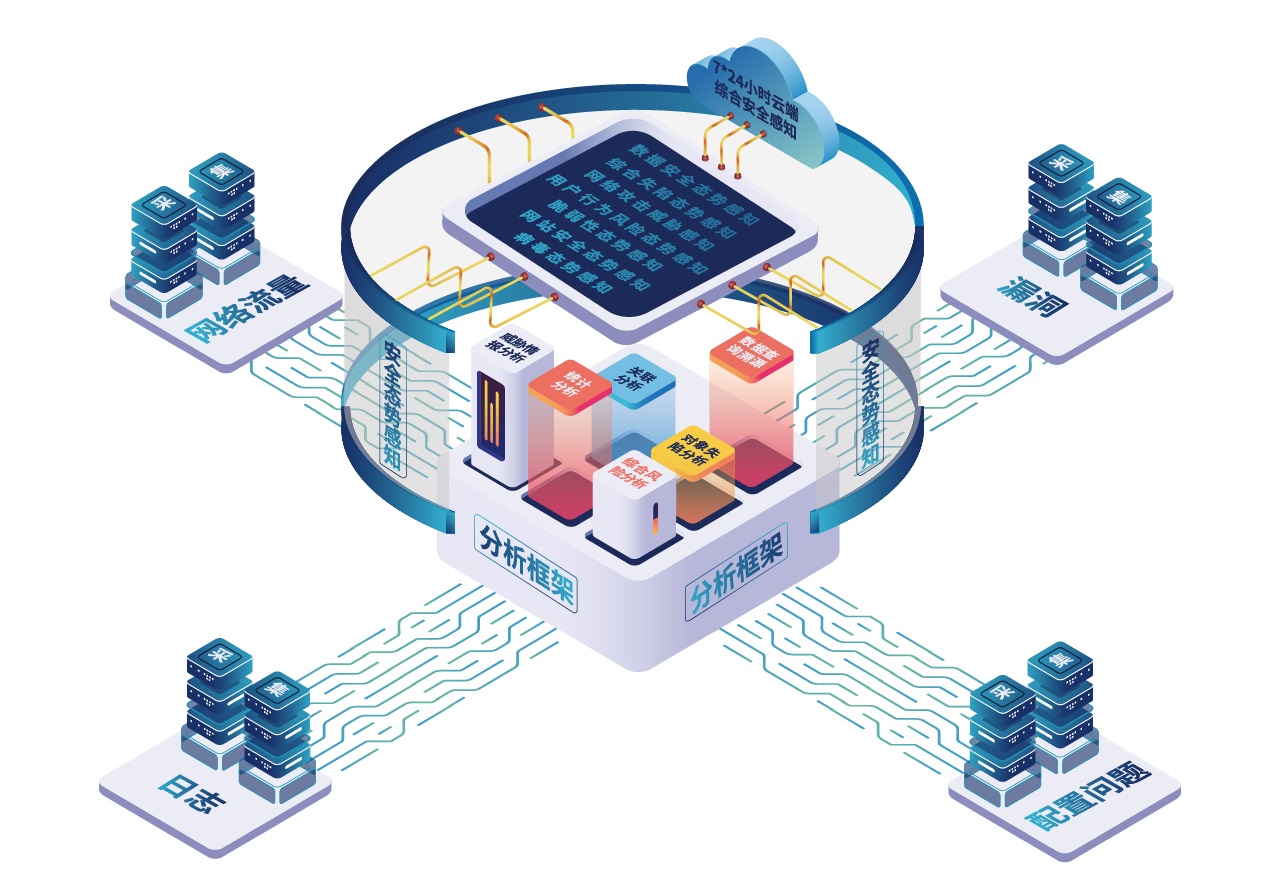 3.数据分析:以关联分析和行为分析为基础,通过智能化分析方法,应对日益复杂的隐蔽攻击和威胁,从数据中发现价值;