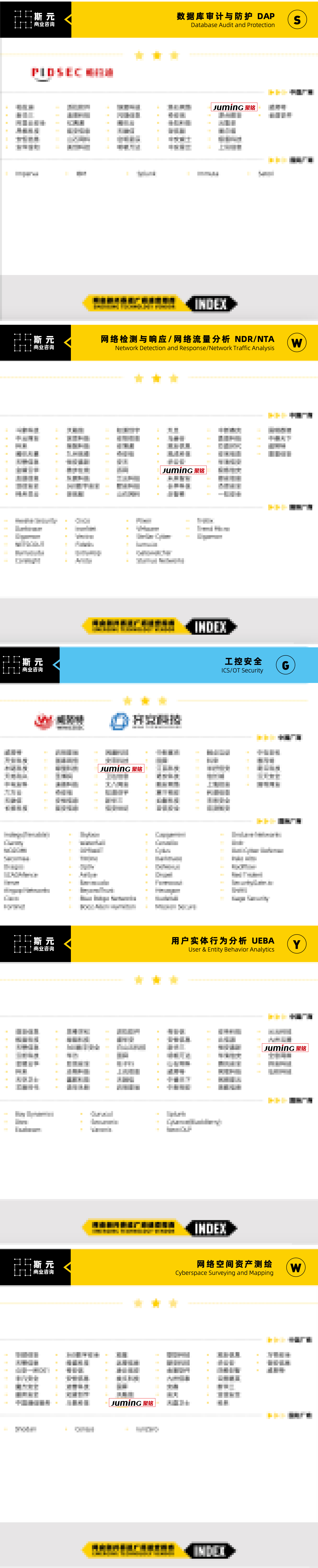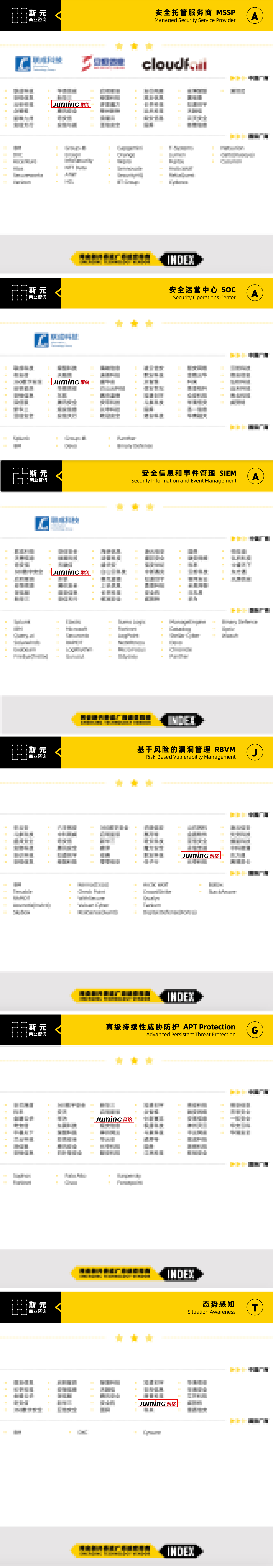 此次《速查指南》中,聚铭网络分别在安全托管服务商MSSP、基于风险的漏洞管理RBVM、安全运营中心SOC、态势感知、用户实体行为分析UEBA、高级持续性威胁防护APT Protection等11个细分赛道领域上榜,彰显了聚铭网络在网安防护建设上的硬核技术实力,得到了业界的充分认可与肯定。