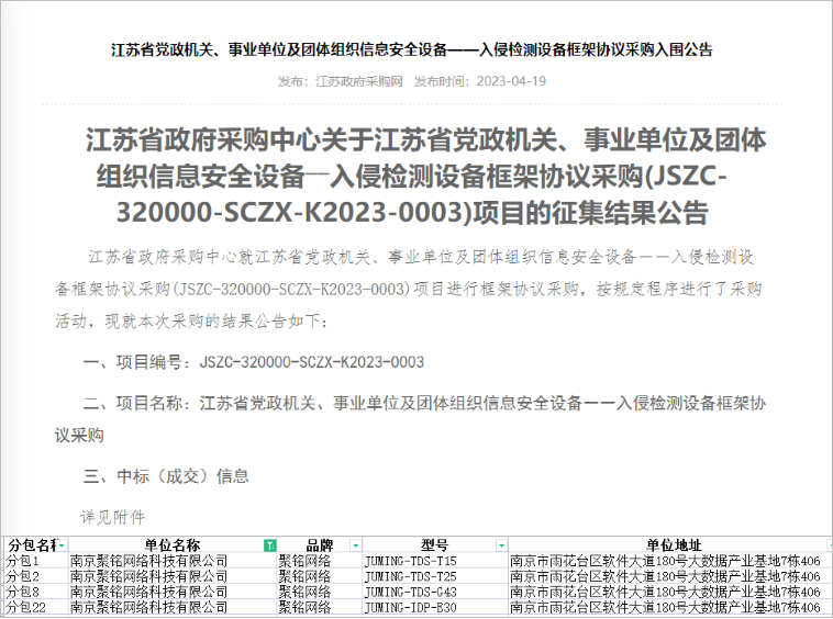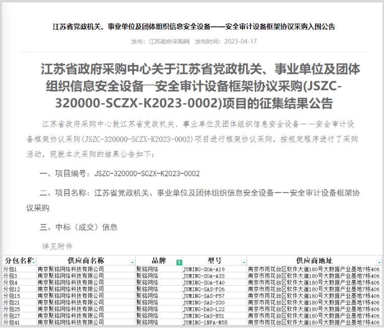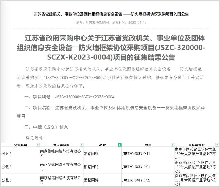 近日,2023年度江苏省政府党政机关、事业单位及团体组织信息安全设备框架协议采购项目入围结果公布,聚铭网络以扎实的技术实力和突出的产品优势得到了高度认可,成功入选多个分包项目!