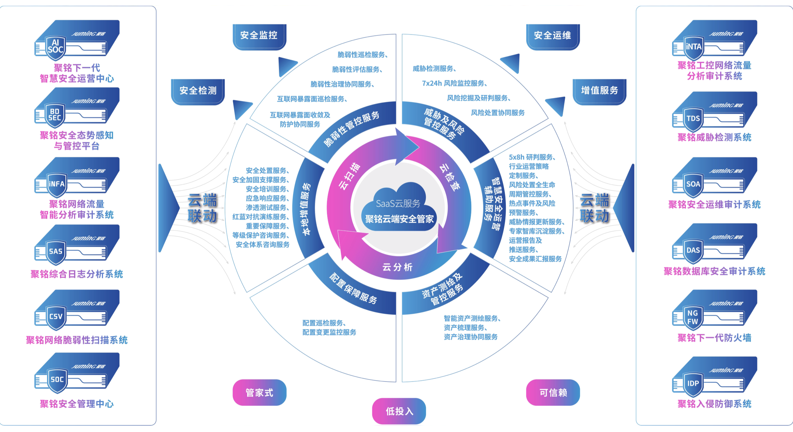 聚铭网络作为国内领先的安全运营商,在以上领域中的产品均经过实际的应用验证,拥有成熟的市场经验,并且具备一定的应用特点和技术优势。公司主打的“云+端”产品服务体系覆盖了安全托管、安全管理、安全审计等众多领域,在资产运营、脆弱性运营、监管运营等多个业务模块上发挥重要作用,从全局、长周期的视角帮助客户运营价值资产的安全状态,满足了客户在网络安全服务方面的多样化需求。