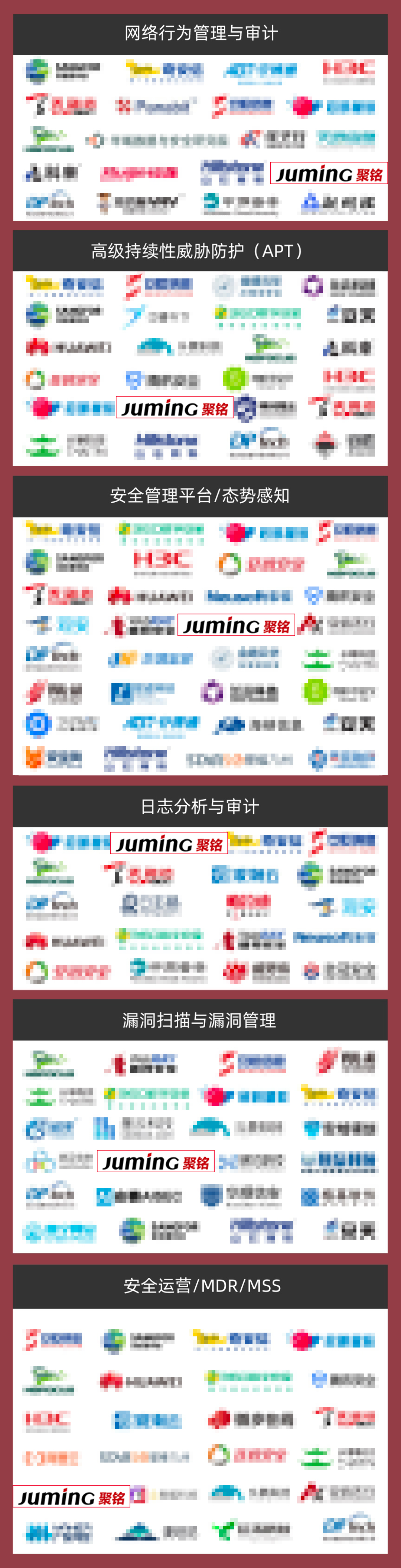 在此次发布的《全景图》中,聚铭网络分别在网络行为管理与审计、高级持续性威胁防护(APT)、安全管理平台/态势感知、日志分析与审计、漏洞扫描与漏洞管理、安全运营/MDR/MSS6个细分领域上榜,彰显了聚铭网络过硬的技术实力,也体现了业内专业媒体对聚铭网络的高度认可与肯定。