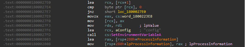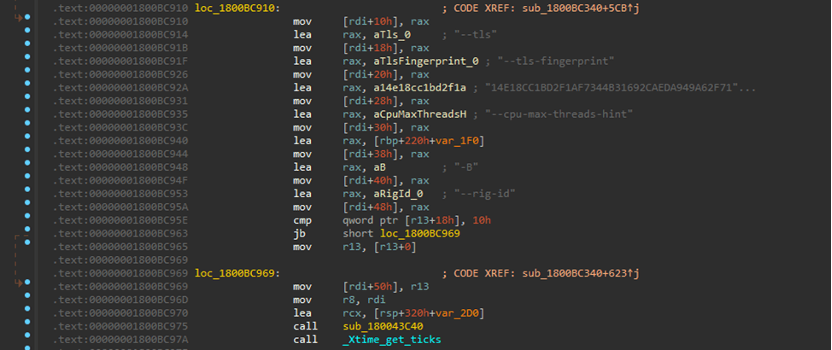 接下来,它读取并解密位于 C:\ProgramData\{ApHash(MachineName)}\{RSHash(MachineName)}\{RSHash(MachineName)} 的主有效载荷(矿工)。此外,加载程序会创建一个进程环境变量 (SetEnvironmentVariable) 配置,其值为 {“addr”:“185.243.112.239:443”,“p”:“143e256609bcb0be5b9f9c8f79bdf8c9”}。