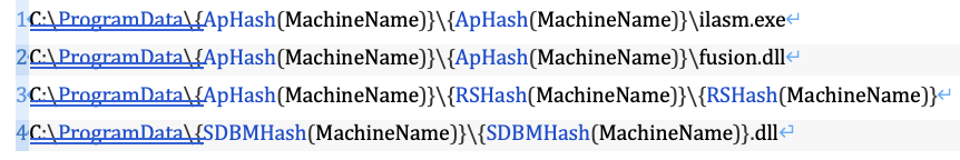 在此之后,将文件复制到先前创建的目录中。然后,恶意软件安装程序的前100个字节将会追加到从“_64_bin”.NET DLL 资源中提取的文件 {RSHash(MachineName)},并生成加密的文件。此外,多达 10240个随机字节会附加到 fusion.dll 和 {SDBMHash(MachineName)}.dll 文件中,从而使反恶意软件产品的哈希检测无效。
