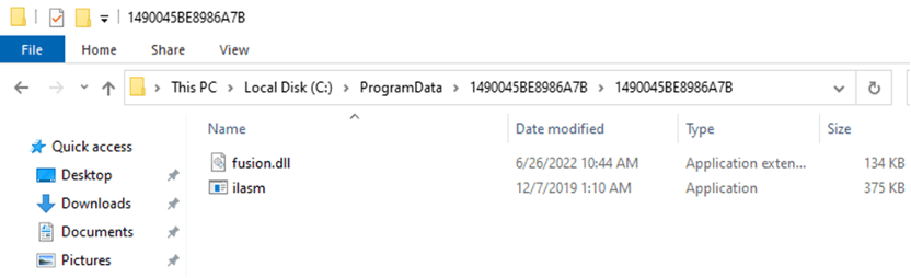 接下来,安装程序启动先前为 ilasm.exe 创建的任务,该任务又加载位于同一目录中的恶意 fusion.dll 库,假设它使用的是合法的 fusion.dll (DLL劫持)。