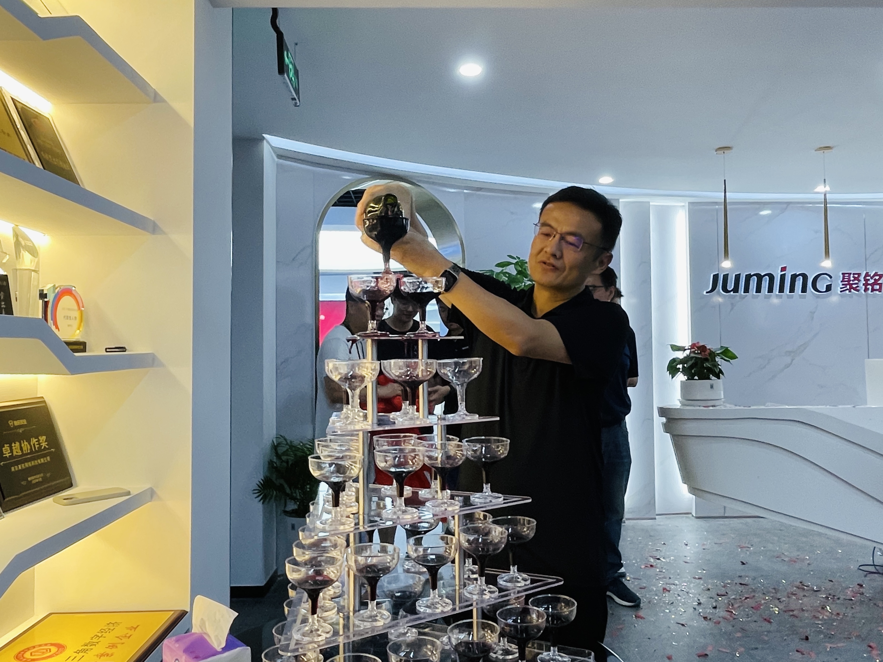 随后,聚铭网络南京新总部在大家的见证下正式揭牌投入使用。在公司荣誉墙前,唐开达先生为聚铭新总部及全体员工斟酒,邀请大家举杯分享此时心中的喜悦之情,并为大家在工作中的辛勤和努力表示感谢。