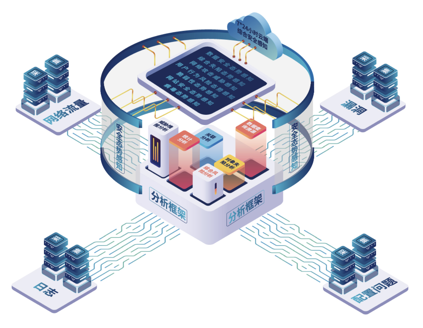 聚铭安全态势感知与管控平台通过在司法局内网中旁路部署的方式,利用网络流量探针采集各类日志信息和脆弱性问题,平台可解析上千种网络协议并对相关元数据进行查询和分析。同时,平台提供的7*24小时的云端综合安全感知,能够实时对司法局内网中的网络攻击、网站安全威胁、用户危险行为、数据安全进行感知,帮助运维人员掌握整体安全状况。