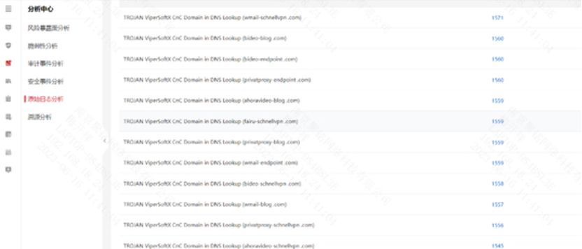 聚铭网络近期在一次对用户的现场安全运维过程中,利用聚铭下一代智慧安全运营中心(AISOC)监测到了若干恶意域名请求的异常行为。经取证后发现,该恶意软件名为ViperSoftX,具有多种混合恶意行为。聚铭网络相关产品报警如下: