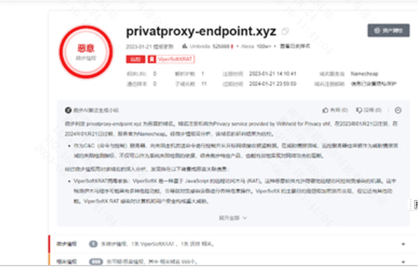 经过查询后,可以看到此类域名已经被标注为恶意,下图是其中一个域名的相关情报: