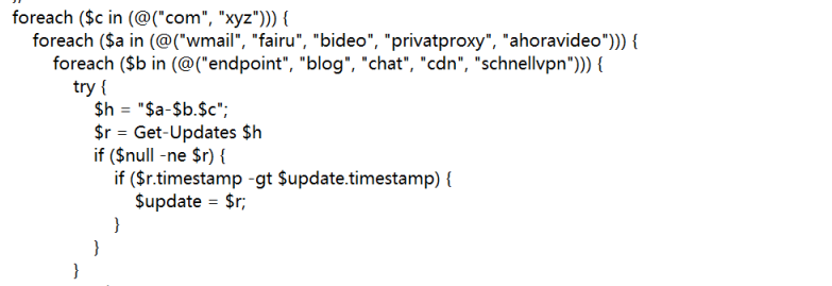 这里使用了一个三重循环,故最多可以变换出50个不同的域名(即2*5*5),以躲避相关安全设备的检测,但由于其使用的还是有限的域名池,因此在聚铭相关专业设备的帮助下能够较为容易地侦测出来。