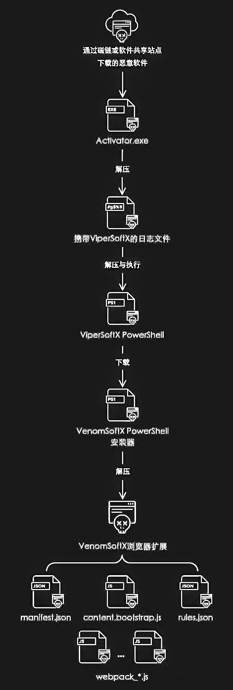 ViperSoftX是一种信息窃取软件,主要功能为窃取加密货币、剪贴板,对受感染的机器进行指纹识别,以及下载和执行任意附加的攻击载荷或命令。ViperSoftX分发的一个有效载荷为特定的信息窃取器,其形式是基于Chromium的浏览器扩展。该恶意扩展通过获取受害者所访问页面的完全控制权限,利用浏览器中间人攻击(MITB)来篡改加密货币交易所上的API请求数据,从而控制加密货币交易。